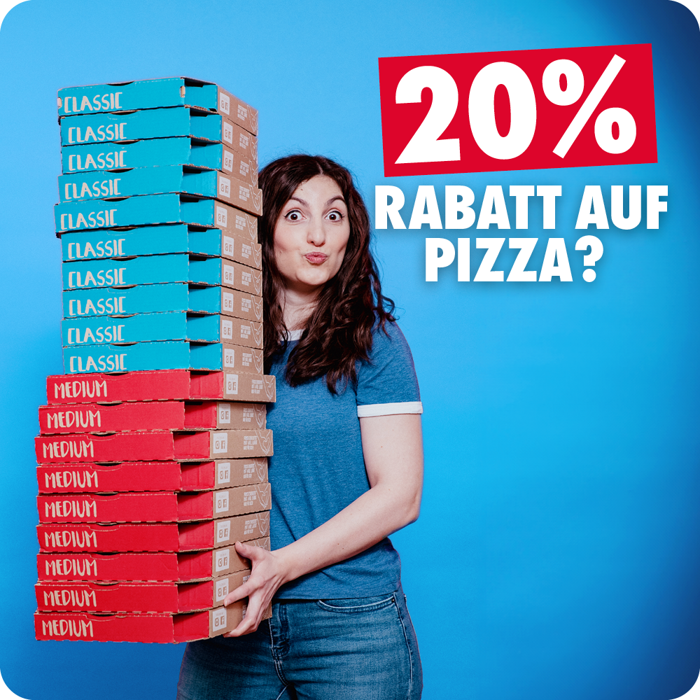 *Die jeweils günstigere zweite Pizza ist um 50 % rabattiert. Gültig für klassischen Pizzarand. Nicht gültig für Lunch Pizzen, sowie Extrazutaten. Bei Lieferung gilt der Mindestbestellwert. Nicht mit anderen Angeboten kombinierbar. keine Barauszahlung. Gültig bis 31.07.2026. Nur in teilnehmenden Stores.
