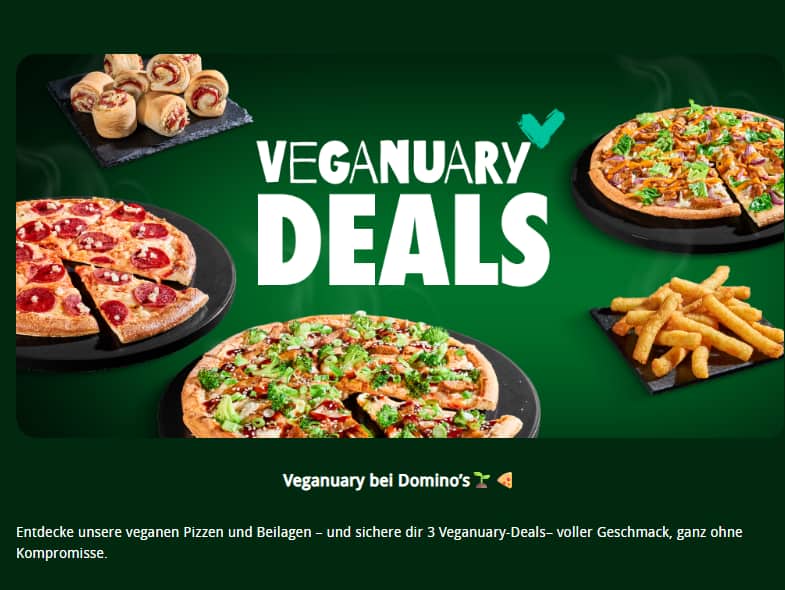 Zum Jahresauftakt setzen viele Konsumierende wieder bewusst auf pflanzliche Alternativen – und Domino’s unterstützt sie mit besonderen Angeboten dabei – im Spotlight: vegane Pizzen und Sides zu attraktiven Preisen. Der Aktionszeitraum läuft vom 05.01. bis 02.02.2026.