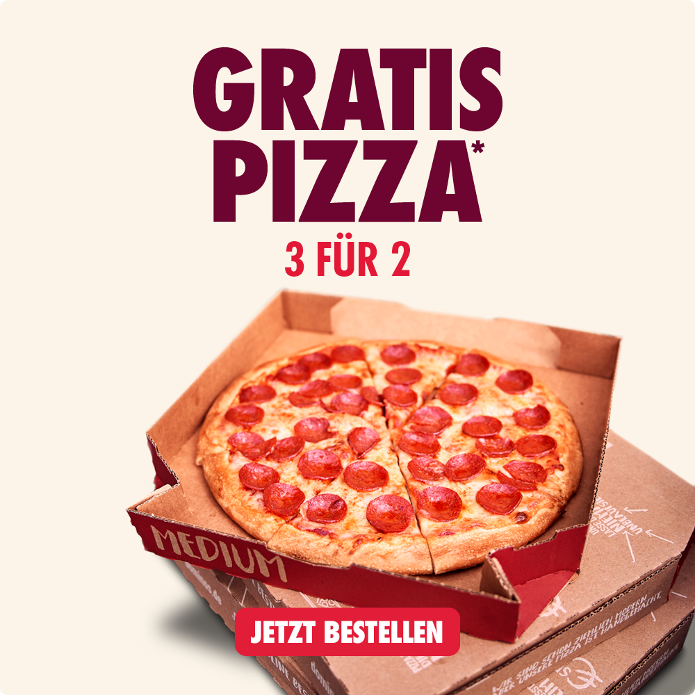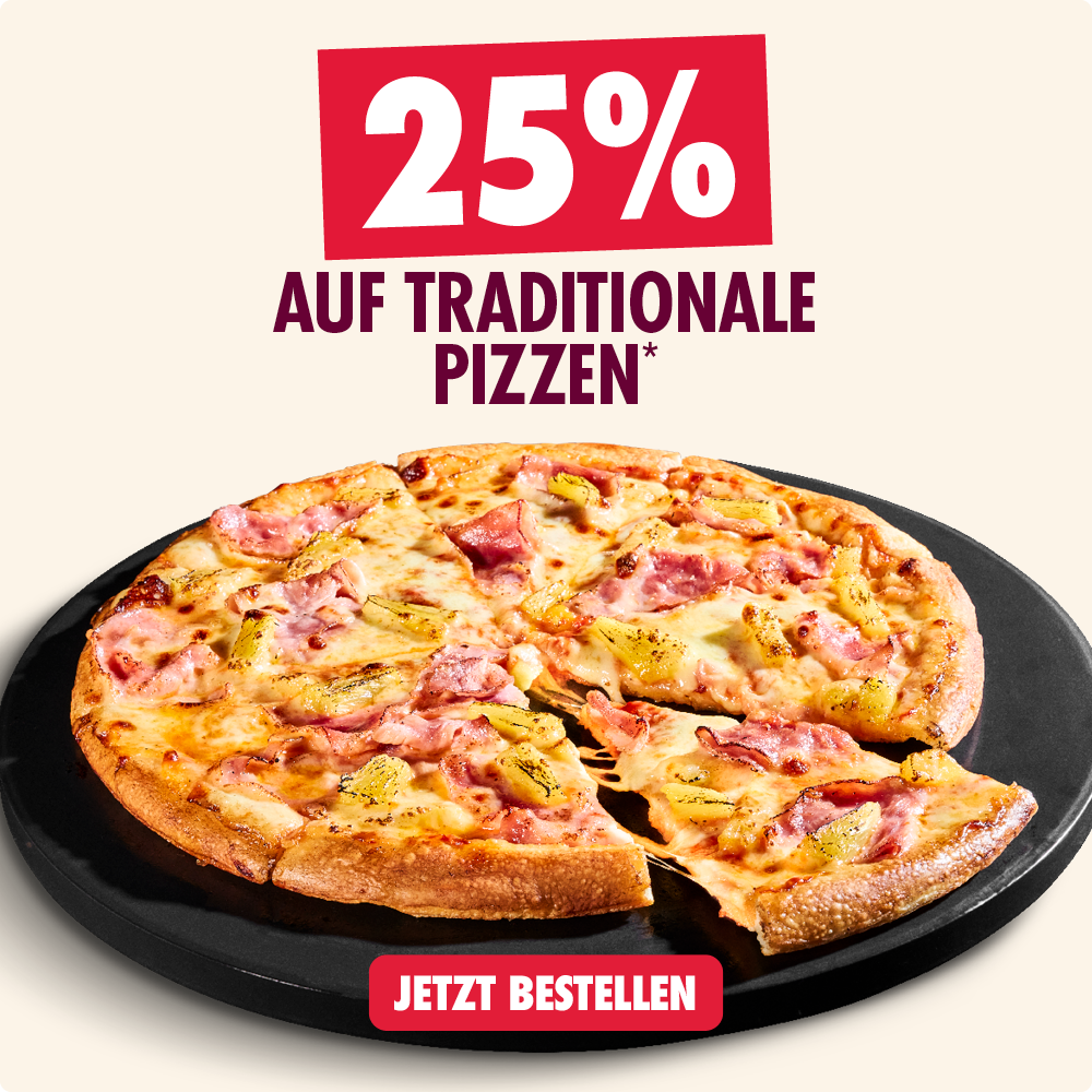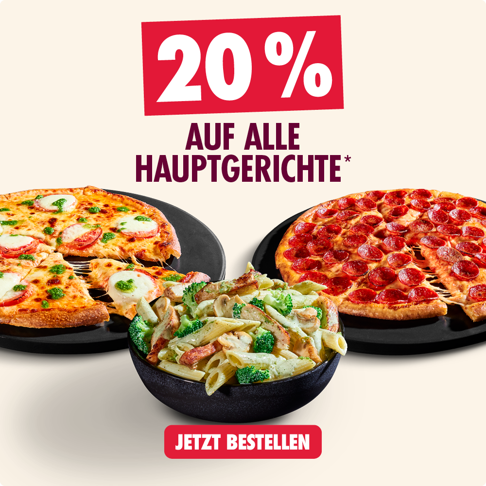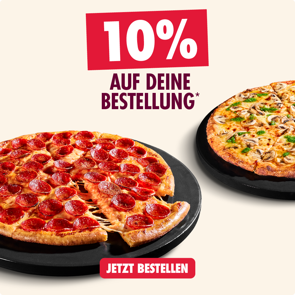 *Alle Codes online einlösbar auf dominos.de oder in der Domino's App in teilnehmenden Stores. Mindestbestellwert aller Deals 15€. Keine Barauszahlung, nicht kombinierbar. Pflichtangaben zu unseren Produkten unter https://www.dominos.de/produkte/pflichtinformationen oder frage unsere Mitarbeitenden. Änderungen/Irrtümer vorbehalten. Anbieter: Domino‘s Pizza Deutschland GmbH, GF: Alexander Tauer, Am Sandtorkai 75-77, 20457 Hamburg.