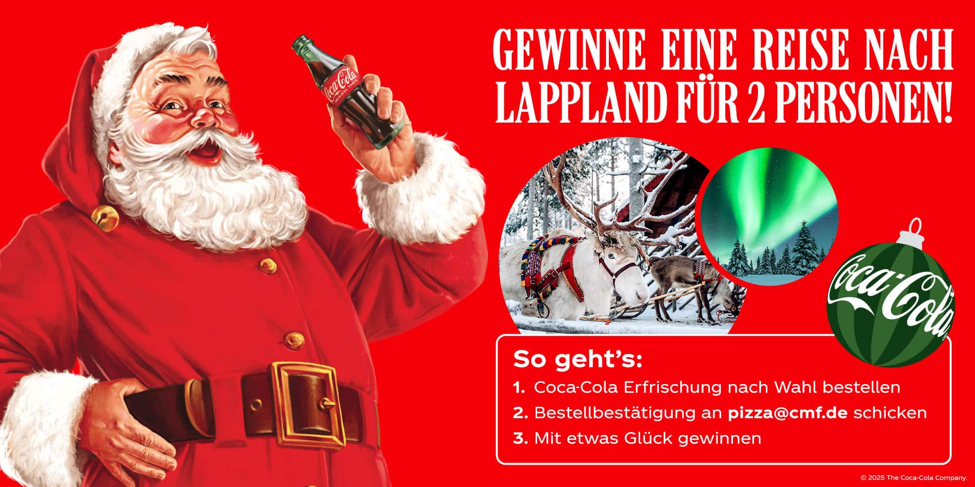 Du träumst davon, einmal Lappland zu erleben? Nordlichter am Himmel, tief verschneite Landschaften, Huskys, Eisabenteuer & magische Wintermomente – und das alles live? Dann kommt jetzt deine Chance! ❄️✨ Vom 21.11 bis 14.12.25 kannst du eine unvergessliche Reise nach Lappland gewinnen. Und das Beste? Die Teilnahme ist super easy: Einfach eine Coca Cola Erfrischung bestellen und schick deine Bestellbestätigung an pizza@cmf.de – schon wanderst du direkt in den Lostopf! Also: winterlich genießen & mitmachen – worauf wartest du? Mit ein bisschen Glück geht’s für dich und eine Begleitung bald in ein echtes Winterwunderland nach Lappland! ❄️🎁✨ 🎉🌏