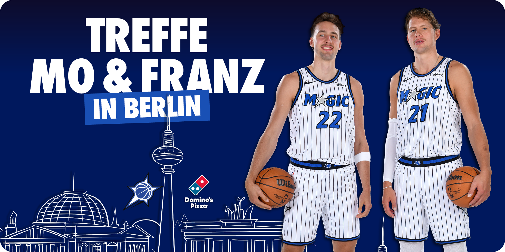 Triff die Basketballweltmeister und Orlando Magic Stars Moritz und Franz Wagner in ihrer Heimatstadt Berlin! Bestell ganz einfach bei uns und trag deine Order-ID und E-Mail Adresse hier unten ein und gewinne mit etwas Glück das Meet'n'Greet mit den Wagner Brüdern.